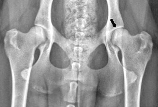 Displasia dell'anca: La radiografia (raggi X) del bacino di un cane normale. La testa del femore (freccia) è seduto profondamente all'interno dell'acetabolo, indicando congruenza eccellente dell'anca.