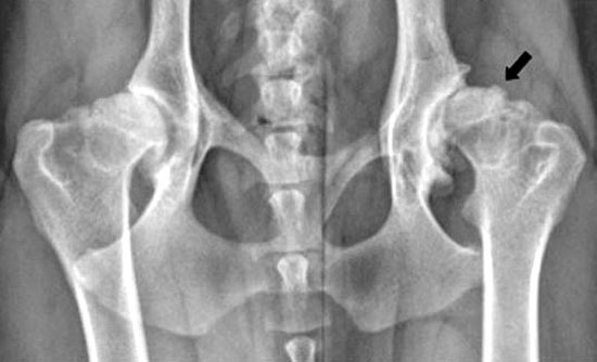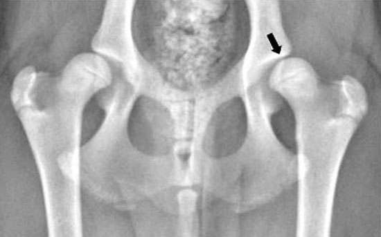 displasia dell'anca. La testa del femore (freccia) è mal inserita